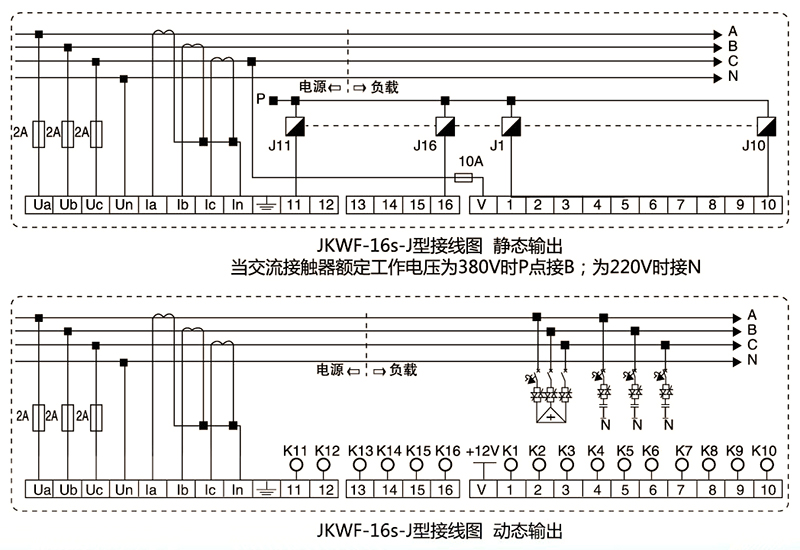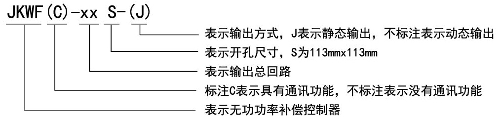 JKWF系列无功功率自动补偿控制器,以高速性能的微处理器为核心器件同时取样3相电压3相电流信号,并提供6种共补+分补补偿方案, 12种投切编码方案,用户可通过修改控制参数任意选择控制参数一经修改后长久保存,掉电不丢失。采用基波功率因素和基波无功功率复合控制电容器组的投切,投切稳定无投切震荡,对电压谐波电流谐波干扰不敏感。适用于交流45Hz-65Hz ,0.4KV以下电力系统无功功率补偿的自动控制器。型号命名